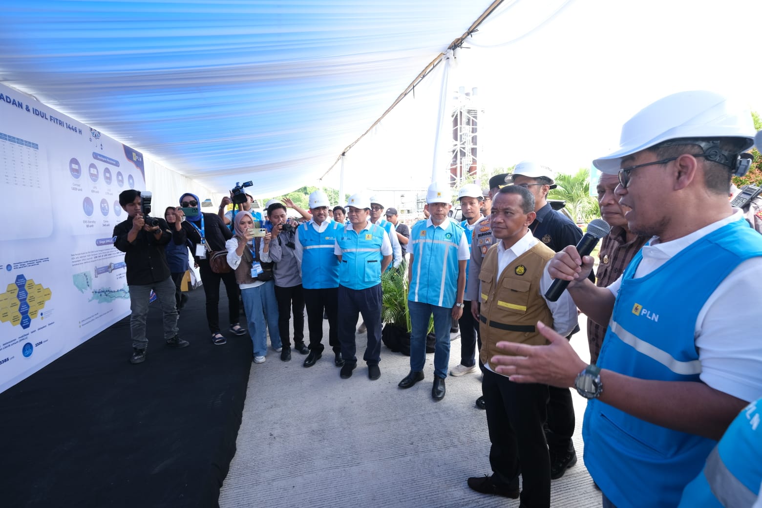 Menteri ESDM Bahlil Lahadalia (dua dari kanan) saat mendengarkan Direktur Manajemen Pembangkit PT PLN Adi Lumakso (kanan) saat menjelaskan kesiapan pasokan listrik nasional di Bulan Ramadhan dan menjelang Idul Fitri. Pada kesempatan ini juga dijelaskan sistem kelistrikan interkoneksi Baubau-Raha dalam kondisi aman, dimana pasokan PLTMG Baubau memegang peran penting dalam memasok energi listrik sebesar 62,17�ri total beban puncak sistem kelistrikan Baubau.