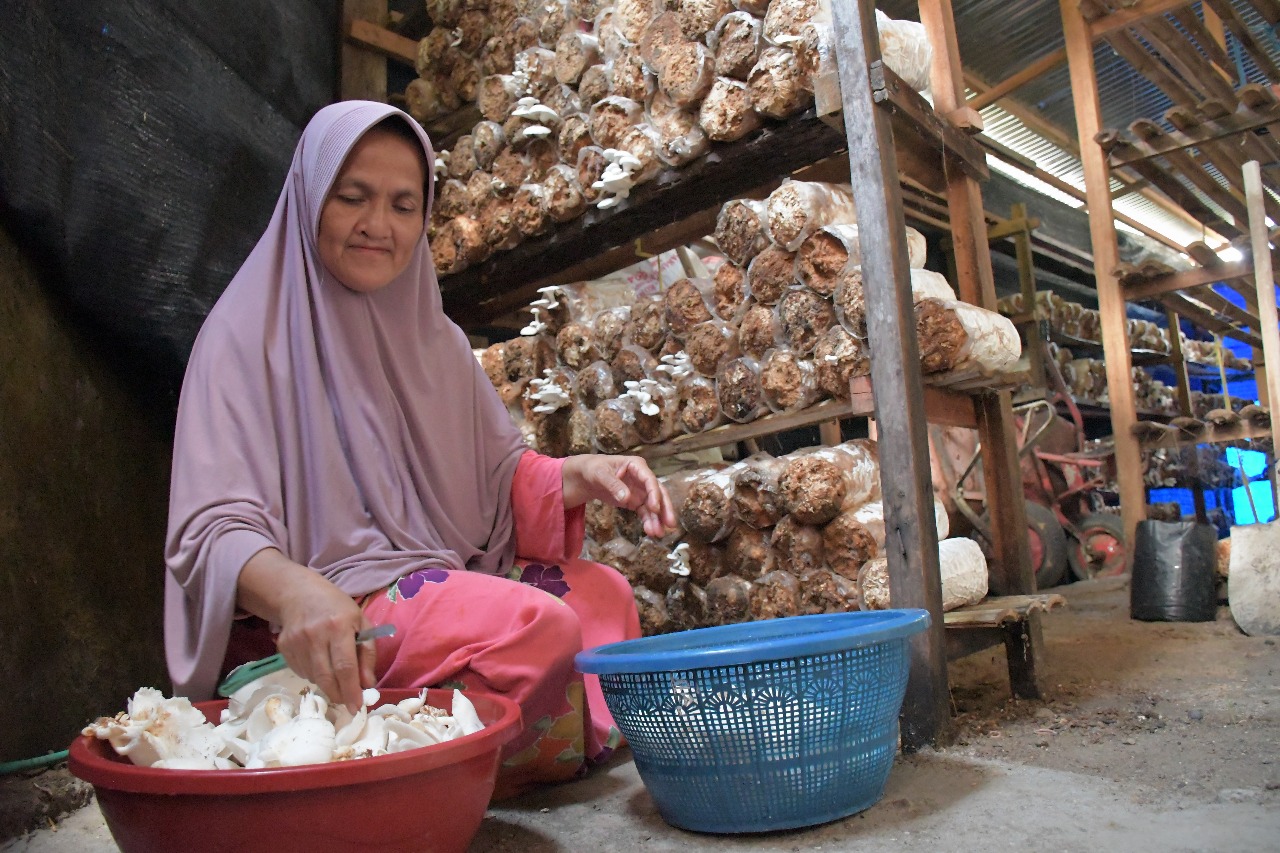 Tin Suarni, pengelola UEP Jamur Tiram Sekolah Perempuan, memanen jamur tiram segar dari media tanam di pondok budidaya Kelurahan Baringin, Lubuk Kilangan, Padang. Hasil panen ini siap dipasarkan, menjadi sumber harapan baru bagi ekonomi perempuan setempat.