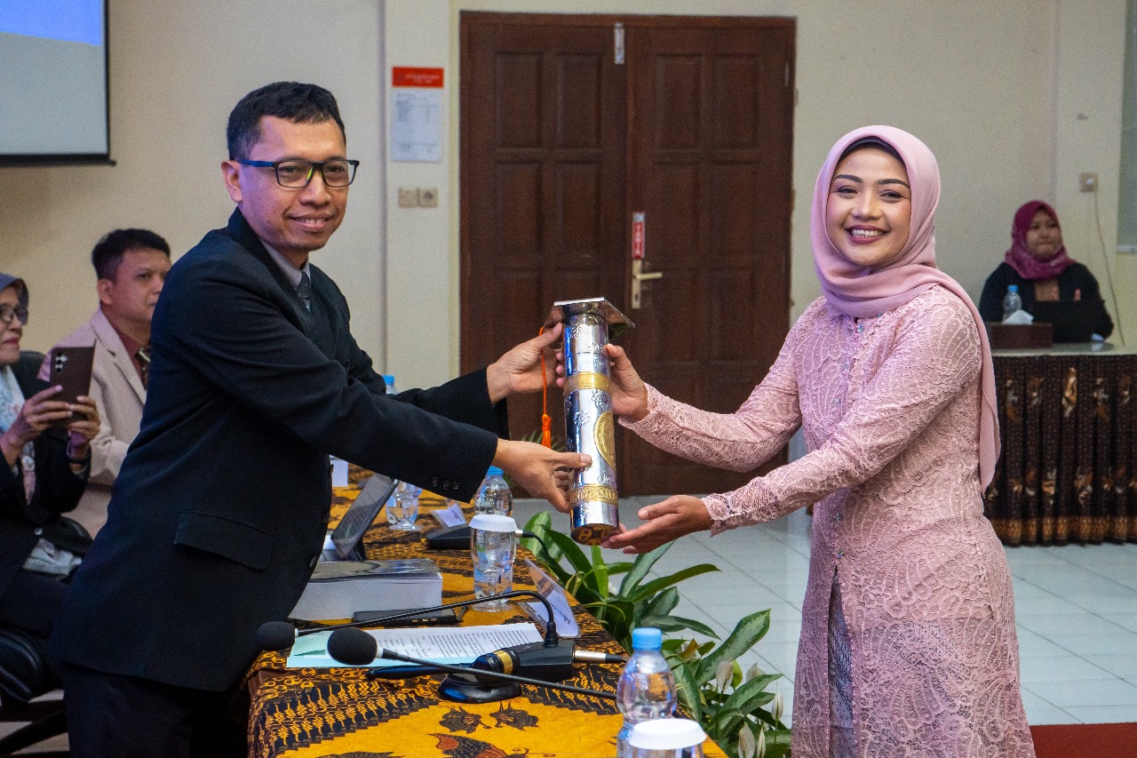 Vinda Maya Setianingrum menerima penghargaan setelah berhasil mempertahankan disertasinya dalam sidang terbuka di Universitas Sebelas Maret. Penelitiannya fokus pada komunikasi krisis dalam penanganan kekerasan seksual di kampus. (Sumber Foto: Unesa)