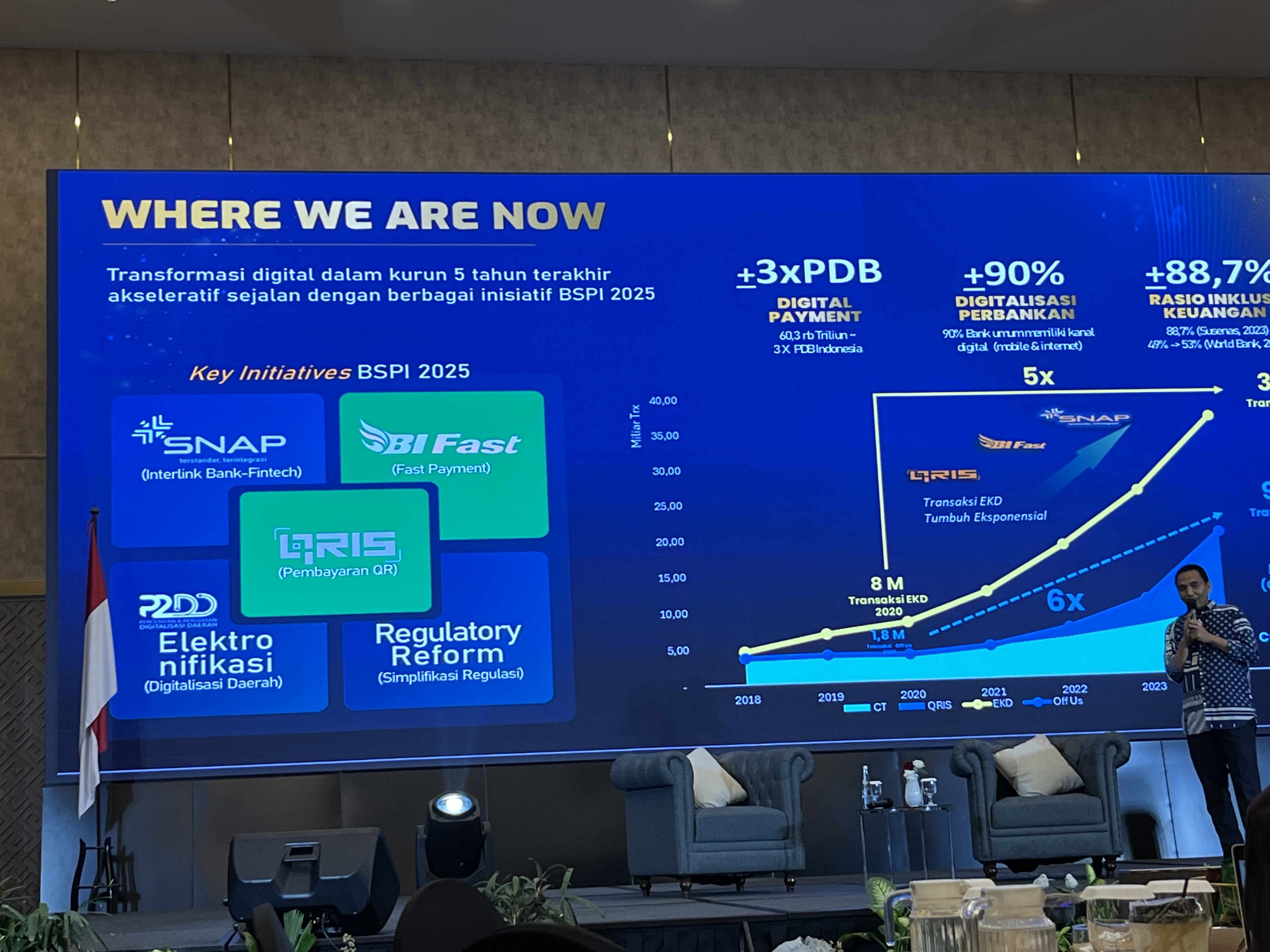 Transformasi digital yang dijalankan BI melalui BSPI 2025 memberikan dampak positif. Nilai transaksi pembayaran digital tercatat mencapai Rp60,3 triliun, atau setara tiga kali Produk Domestik Bruto (PDB) Indonesia. Selain itu, 90�nk di Indonesia telah mengadopsi kanal digital, baik melalui mobile banking maupun internet banking.