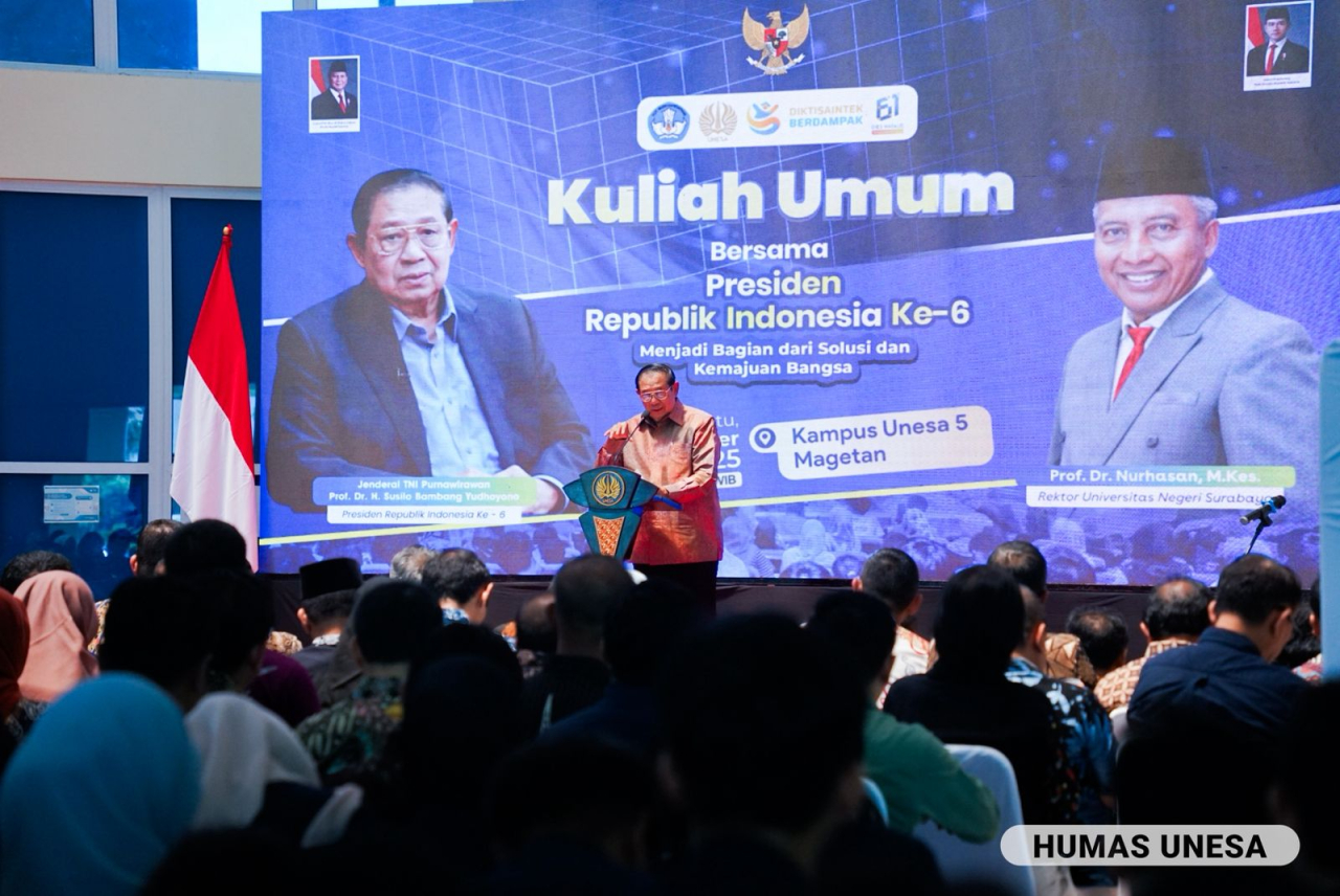 Kilasbisnis.com,Surabaya - Presiden keenam RI **Susilo Bambang Yudhoyono (SBY)** mengajak mahasiswa dan civitas akademika Universitas Negeri Surabaya (Unesa) menjadi lokomotif kemajuan bangsa. Pesan itu ia sampaikan dalam kuliah umum bertajuk *“Menjadi Bagian dari Solusi dan Kemajuan Bangsa”* di Kampus 5 Unesa, Magetan, Sabtu (18/10).