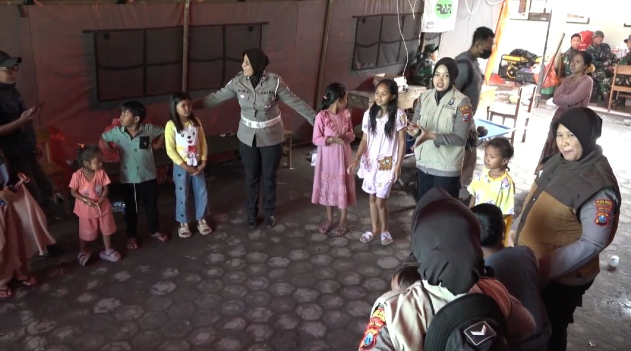 Kegiatan digelar di Posko Pengungsian SD Negeri 4 Supiturang, Kecamatan Pronojiwo, Selasa (25/11). Sejumlah polisi wanita dari Biro SDM Polres Lumajang mengajak anak-anak bermain dan bernyanyi bersama di bawah tenda pengungsian sebagai bagian dari terapi pemulihan pascabencana.