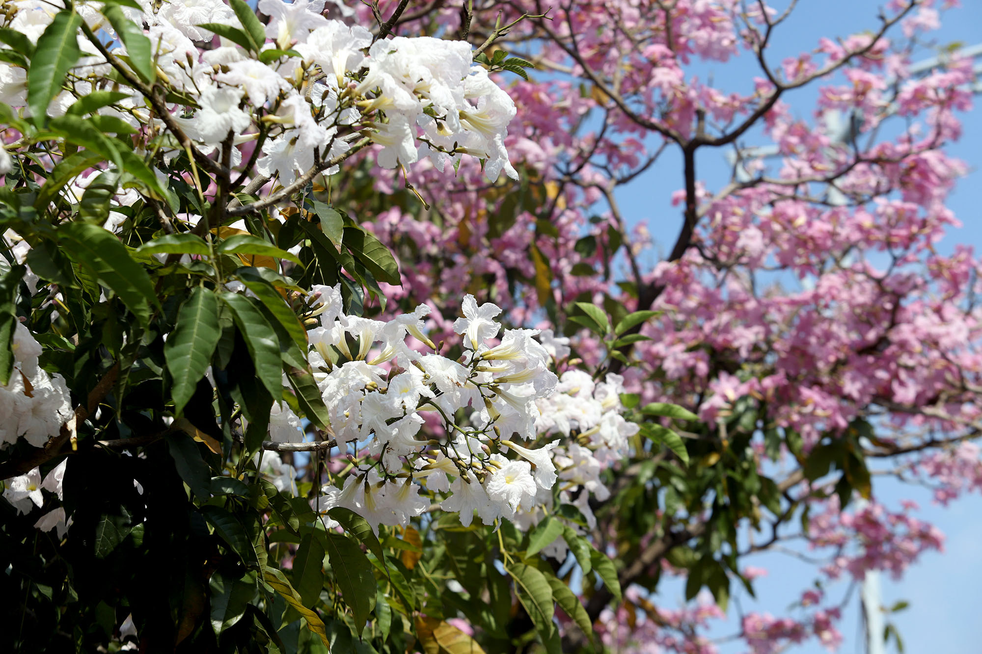 "Beberapa bunga Tabebuya sedang mekar saat ini, ada yang berwarna putih, pink, merah, dan kuning," jelas Hebi.