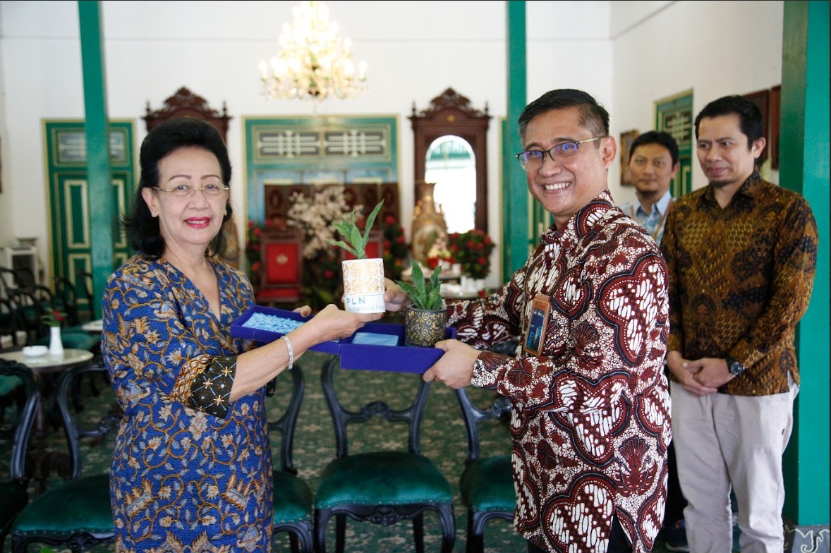 Gusti Kanjeng Ratu Hemas (Kiri) menerima simbolis penyerahan pot berbahan baku FABA dari Direktur Manahemen Human Capital dan Administrasi PLN Nusantara Power Karyawan Aji di lingkungan Keraton. (Sumber gambar: Tim Humas PLN NP)