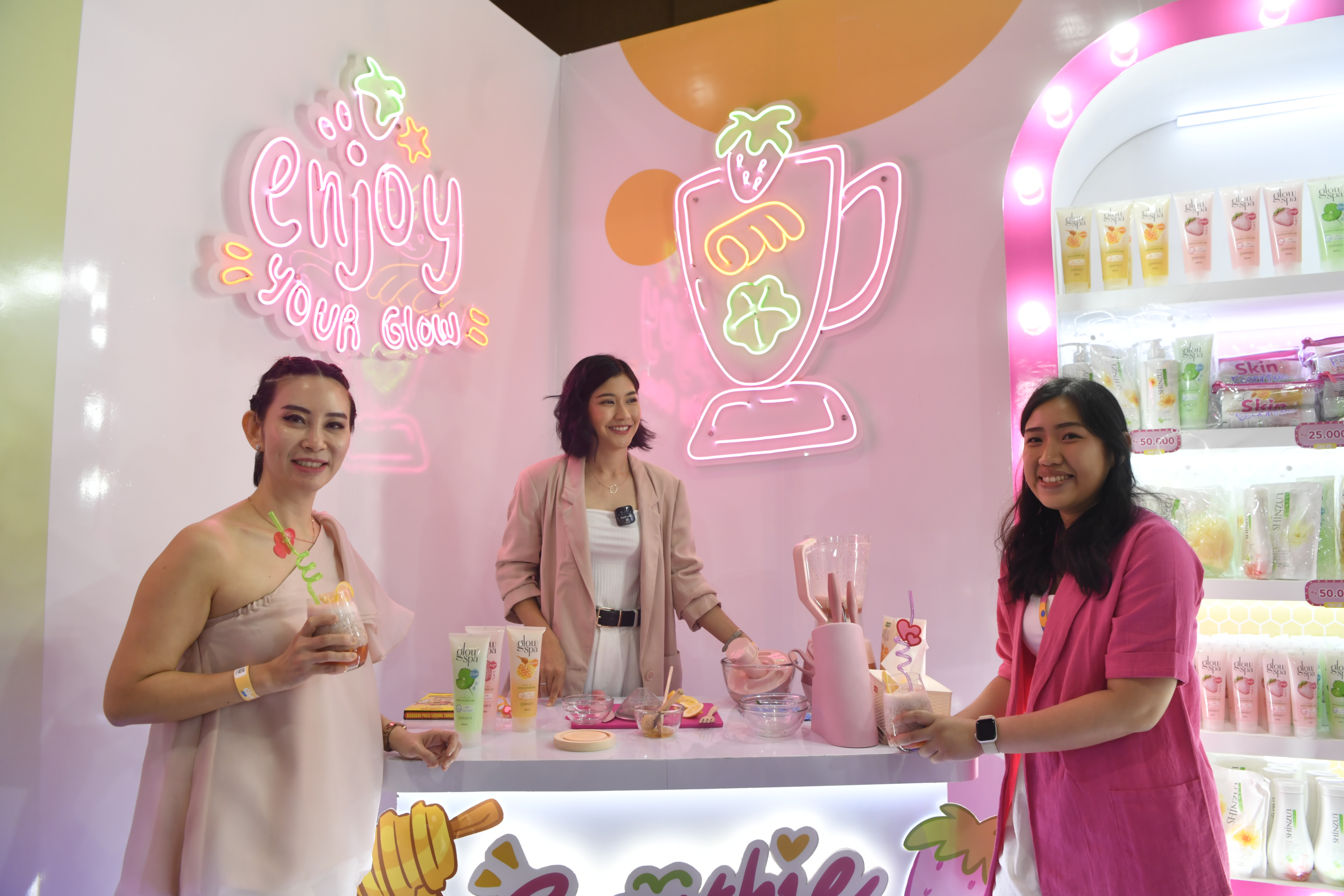 (kiri-kanan) Skin expert, dr. Leni Kumalasari, Celebrity chef Olivia Tommy dan Brand Manager Shinzu’i, PT Bina Karya Prima Fiona Indriani Ranti di booth Shinzu'i di Girl Fest di Tunjungan Plaza 3, Surabaya, Jumat (22/9/2023). (Sumber gambar: Istimewa)