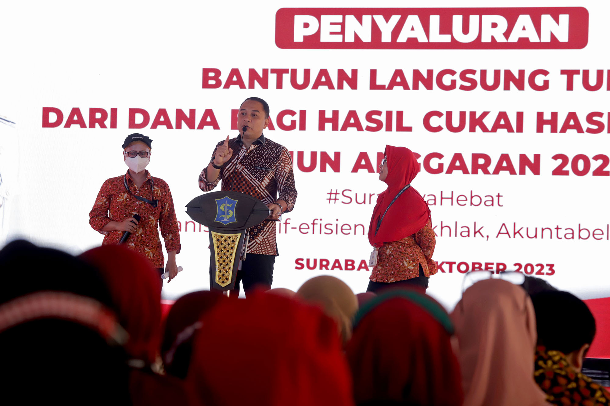Wali Kota Surabaya Eri Cahyadi saat   menyerahkan Bantuan Langsung Tunai Dana Bagi Hasil Cukai Hasil Tembakau kepada 3.044 pekerja Sigaret Kretek Tangan (SKT) Sampoerna di Surabaya, Senin (2/10/2023).