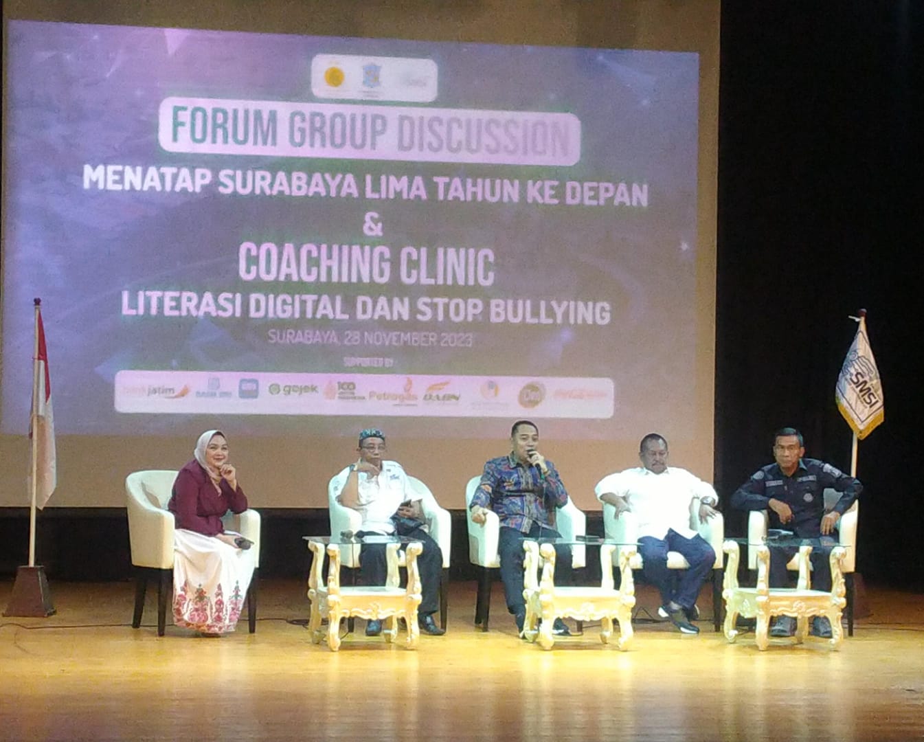 Kilasbisnis.com, Surabaya -  Teknologi digital telah merevolusi berbagai aspek kehidupan. Meski memiliki banyak manfaat namun teknologi juga memiliki dampak negatif begitu besar apabila tidak digunakan secara bijak. Hal tersebut  disampaikan Wali Kota Surabaya Eri Cahyadi dalam acara Forum Group Discussion (FGD) bertajuk "Menatap Surabaya 5 Tahun Ke Depan" dan coaching clinic "Literasi Digital dan Stop Bullying" di Gedung Balai Budaya kompleks Balai Pemuda, Surabaya, Selasa (28/11/2023).