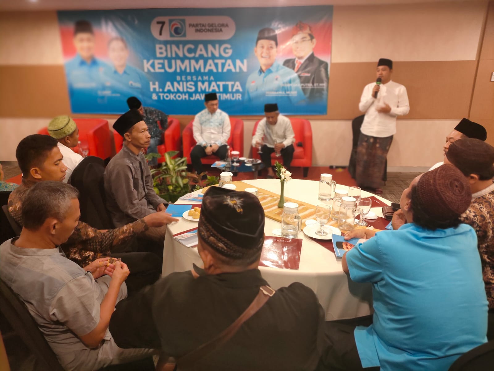 kilasbisnis.com, Surabaya - Dalam kunjungannya ke Jawa Timur, Ketua Umum Partai Gelora, Anis Matta mengadakan diskusi dengan para tokoh masyarakat Jatim. Acara yang disebut Bincang Keumatan Bersama Anis Matta dan Tokoh Masyarakat Jawa Timur tersebut dihadiri oleh sejumlah ulama, kiai, habaib, dan gus dari berbagai wilayah di Jatim.
