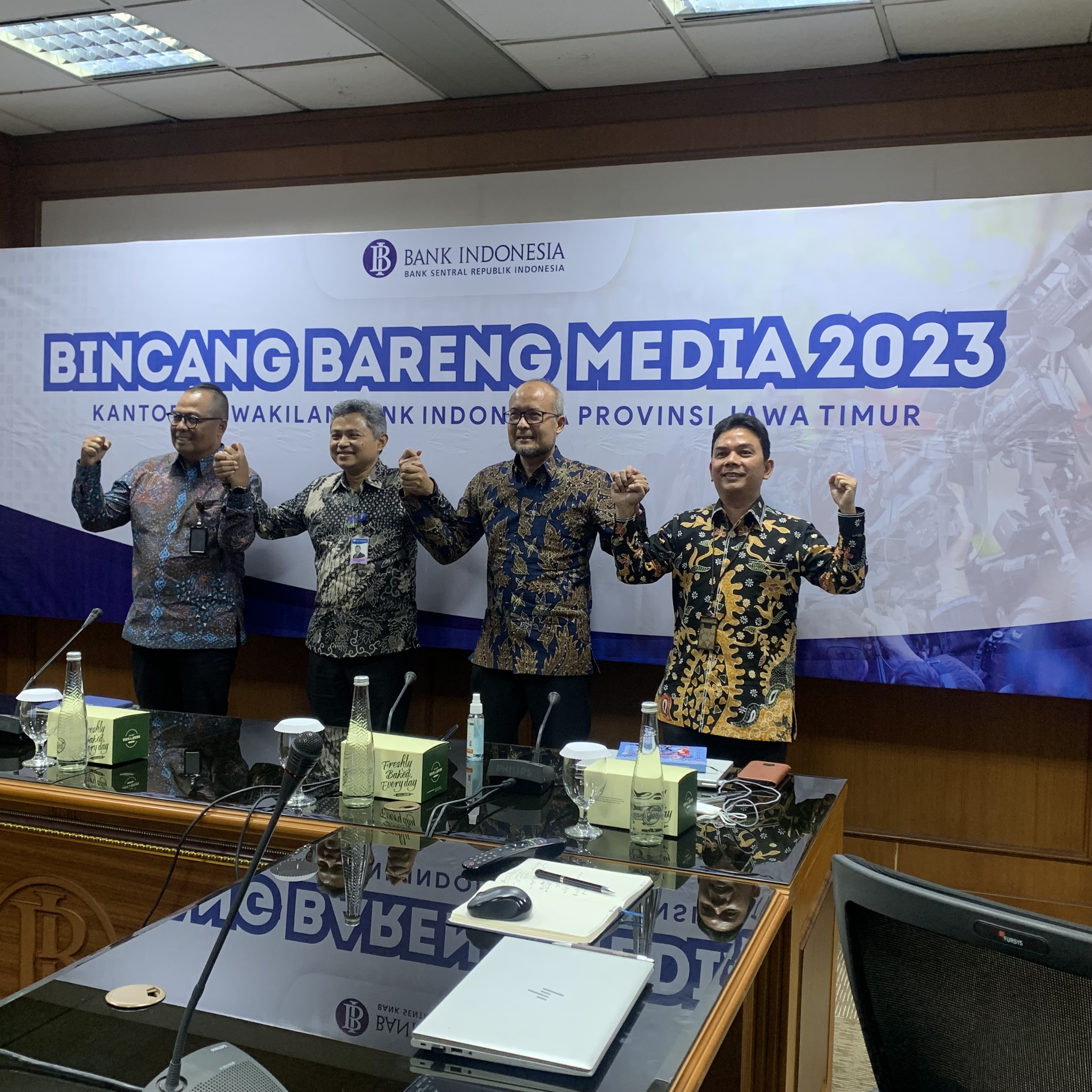 Dari kiri - kanan, Deputi Kepala Perwakilan BI Jatim Bandoe Widiarto, Kepala Perwakilan BI Jatim Doddy Zulverdi, Deputi Kepala Perwakilan BI Jatim Rizki E. Wimanda dan Advisor BI Jatim Muslimin Anwar usai menggelar Bincang Bareng Media (BBM) Desember 2023 di Surabaya, Selasa (12/12/2023). (Sumber gambar: Kilasbisnis.com)
