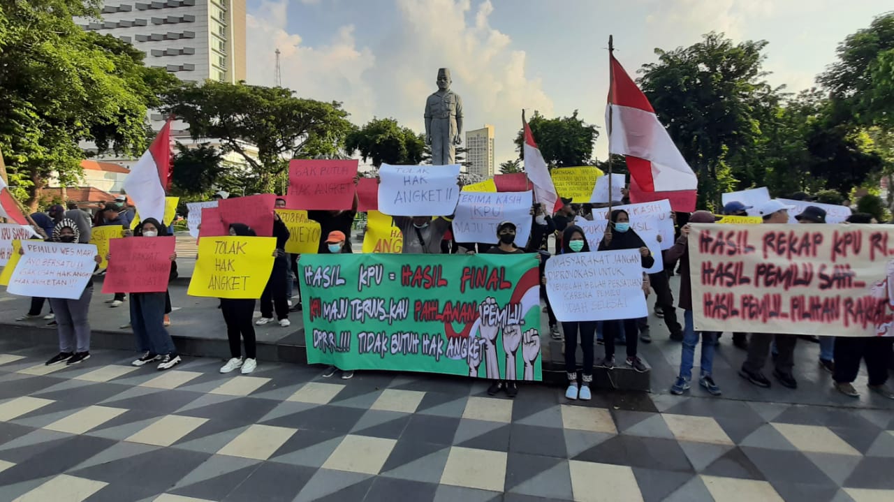 Dalam aksi damai tersebut, mereka membawa atribut bendera dan beberapa poster serta banner yang bertuliskan 'Tolak Hak Angket', 'Hasil Pemilu sah' dan 'Hasil pemilu pilihan rakyat'.