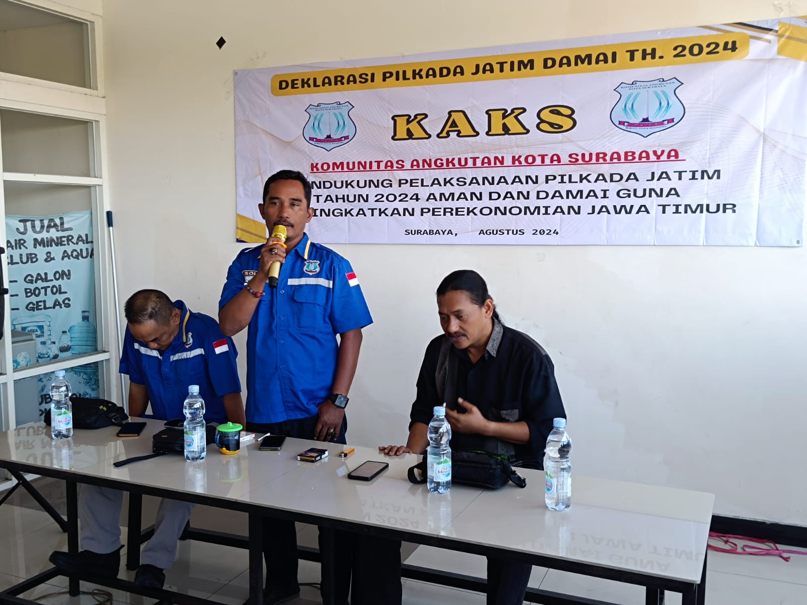 Deklarasi PemiluKada Jatim aman dan damai ini, dilangsungkan Komunitas Angkutan Kota Surabaya di Warung Barokah lantai 2 Terminal Joyoboyo Surabaya, dengan dihadiri sebanyak 100 orang anggota dan pengurus, Selasa 20 Agustus 2024.