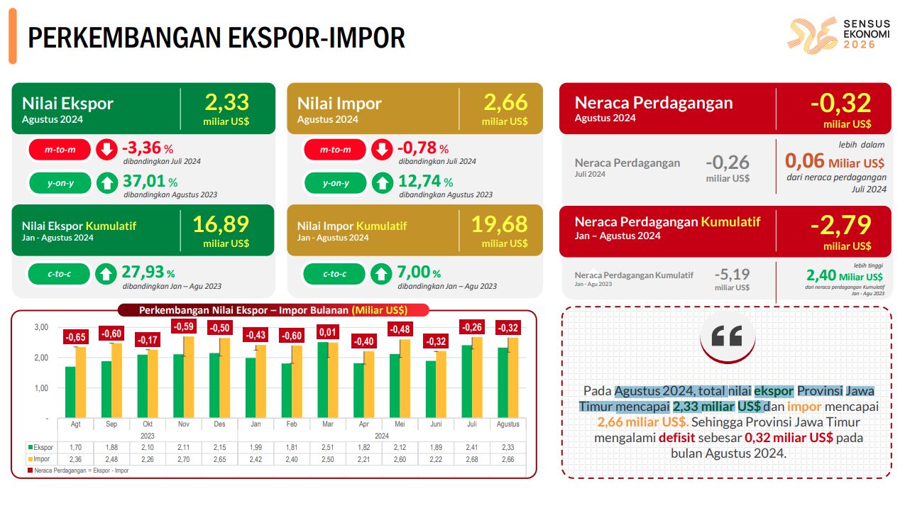 Kepala Badan Pusat statistik BPS Propinsi Jawa Timur Zulkipli, pada Selasa, (01/10/2024) memaparkan, nilai tersebut jika dibandingkan dengan Agustus 2023 juga mengalami peningkatan sebesar 36,07 persen. Sedangkan ekspor migas Agustus 2024 mencapai USD 18,01 juta atau mengalami penurunan signifikan yaitu sebesar 86,68 persen dibandingkan Juli 2024.
